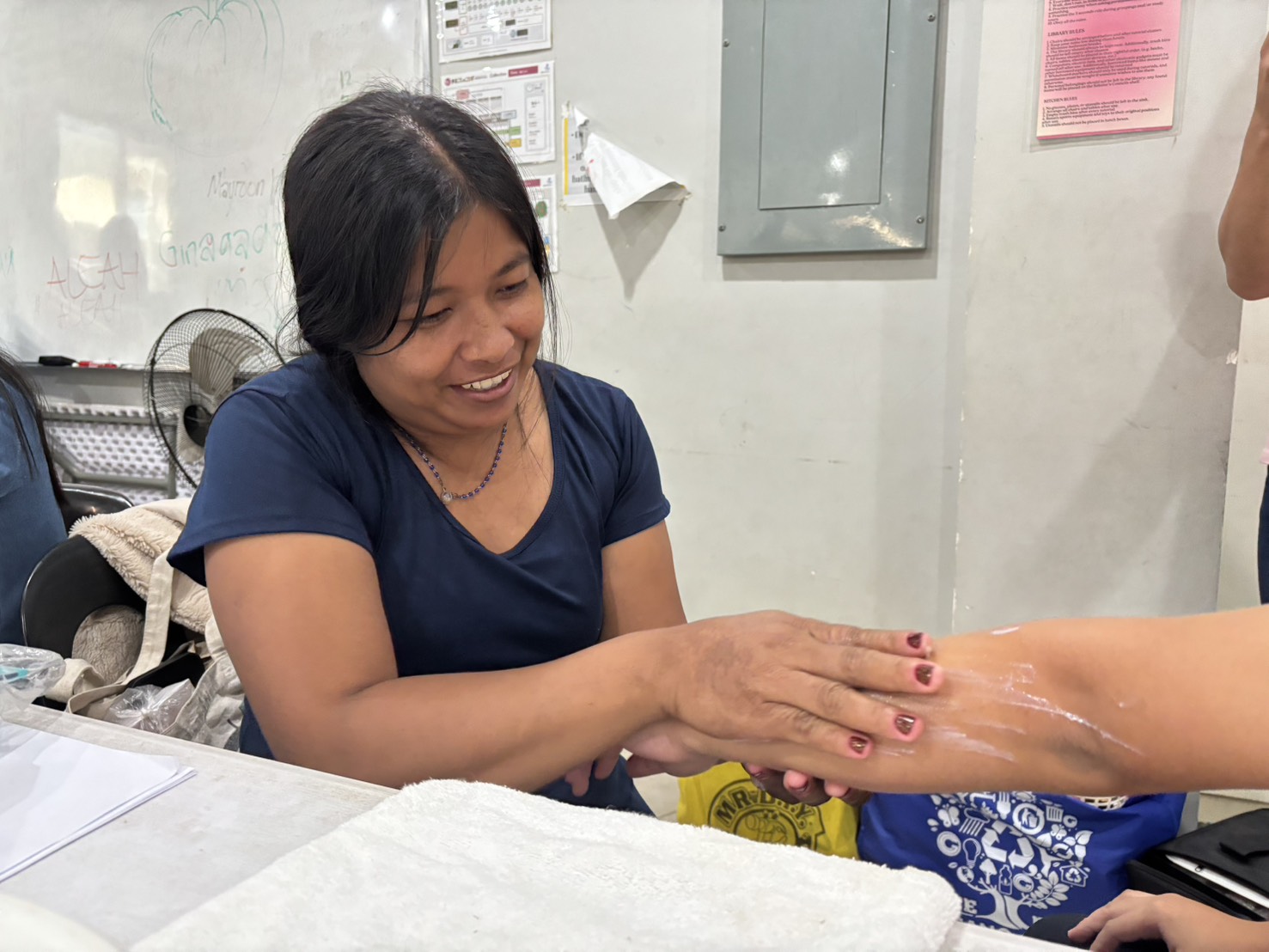 まずは講師からハンドマッサージの効果(リラックス、血行促進、ストレス緩和など)の説明があり、正しい姿勢や衛生管理、適切な力加減の大切さが強調されました。