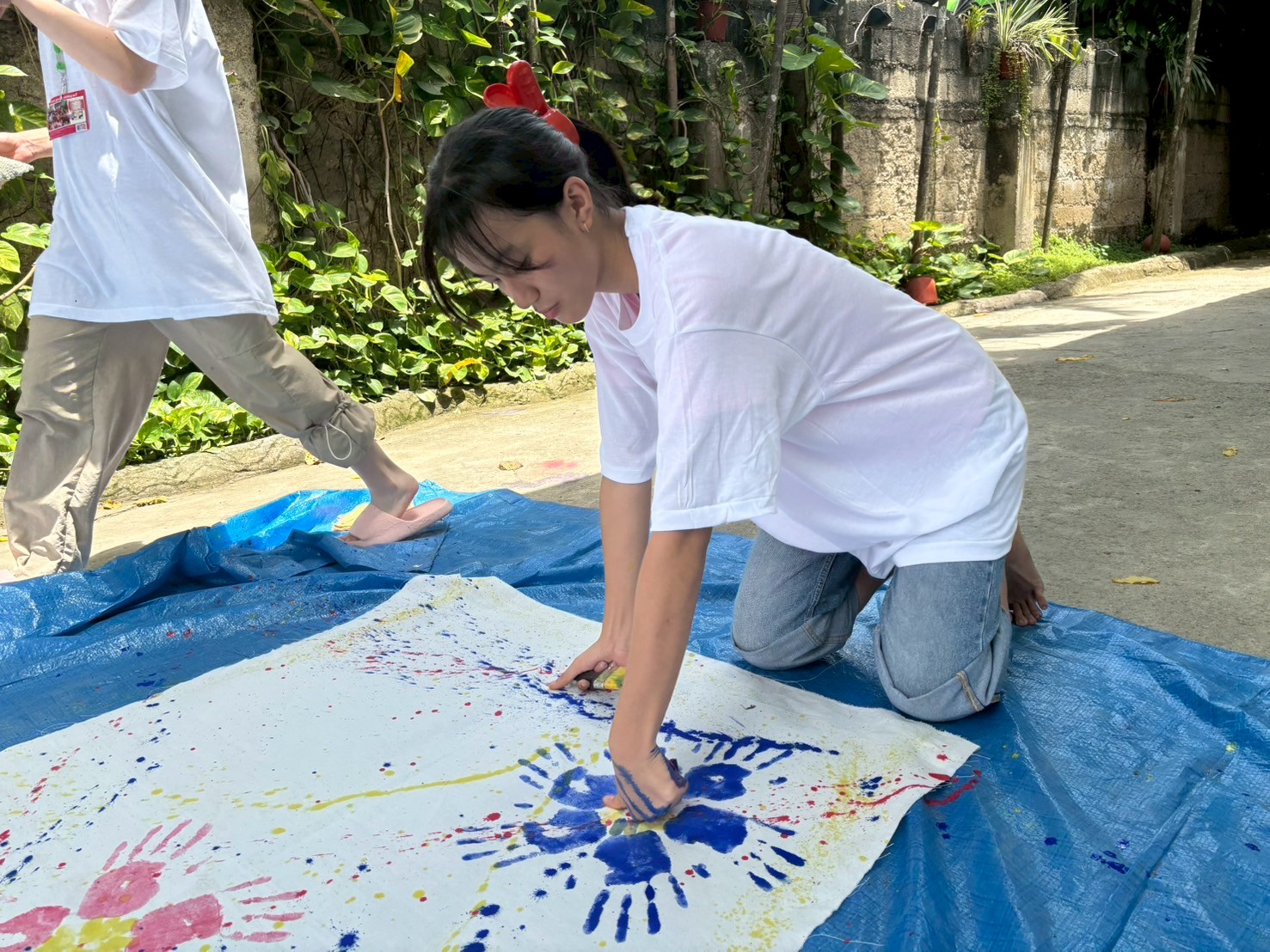 大きな白い布を広げると、学生と奨学生は「どんな色を使おうか」「この模様で何を表そうか」と意見を交わしながら、絵の具を思い切り垂らしていきました。色が重なり合うたびに歓声があがり、夢中になって表現に取り組む姿が見られました。