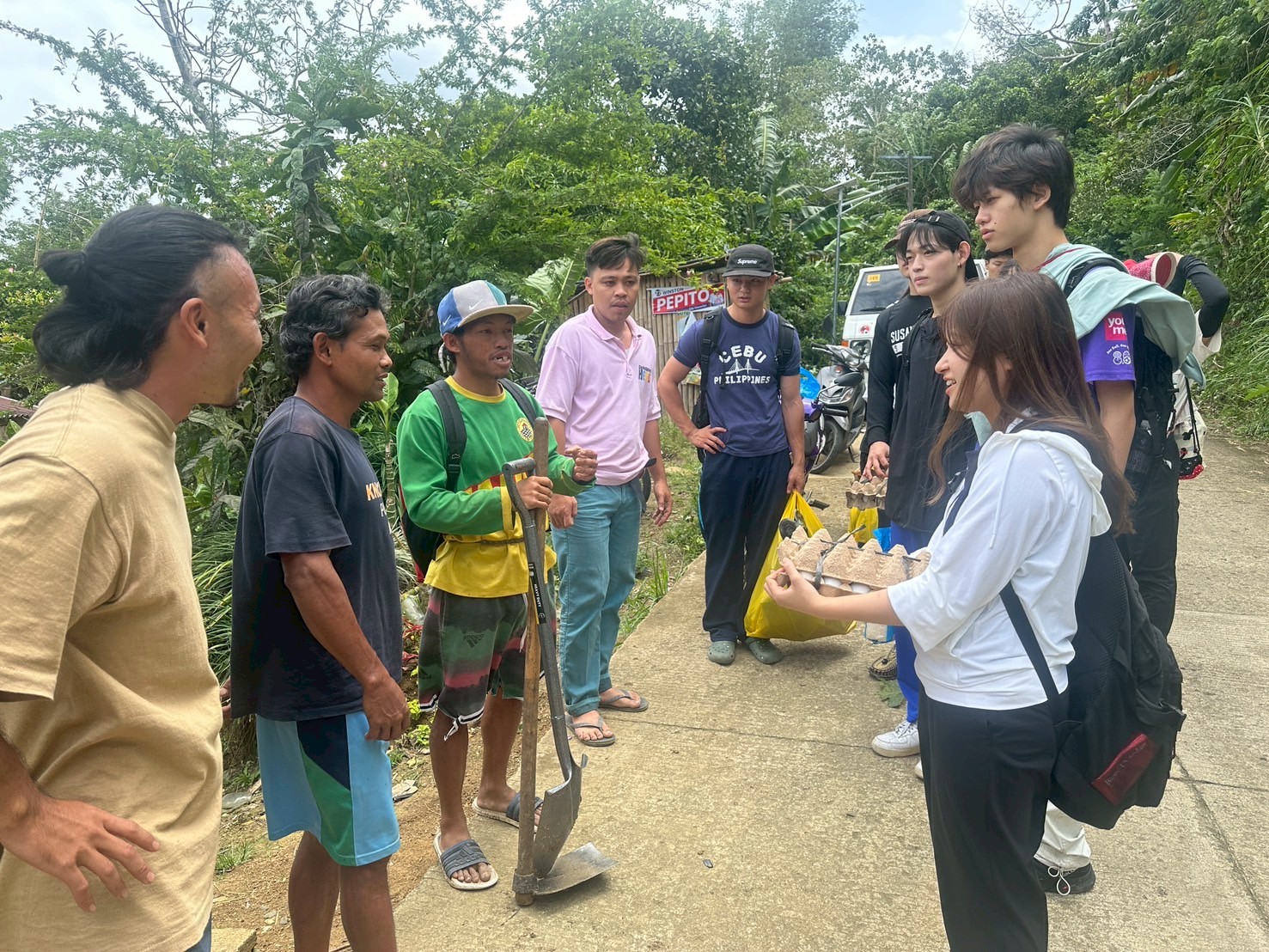 その後、DAREDEMO HEROのモデルファームを訪問しました。農業インターンのZENや現地農家から話を聞き、このTaptap地区が抱える課題について理解を深めました。どれだけ汗を流して働いても世帯収入は月に1万円程度しか得られないこと仲介人によって不当な価格で取引されていること、そして農業において正しい「知識」を身につけることの重要性などさまざまな実態を知り、学生たちは真剣な表情で今後の農業の在り方について考えていました。