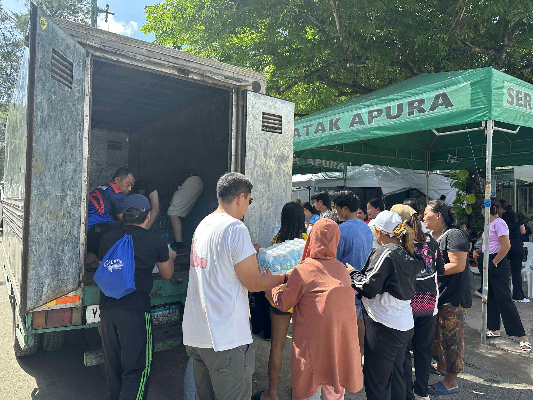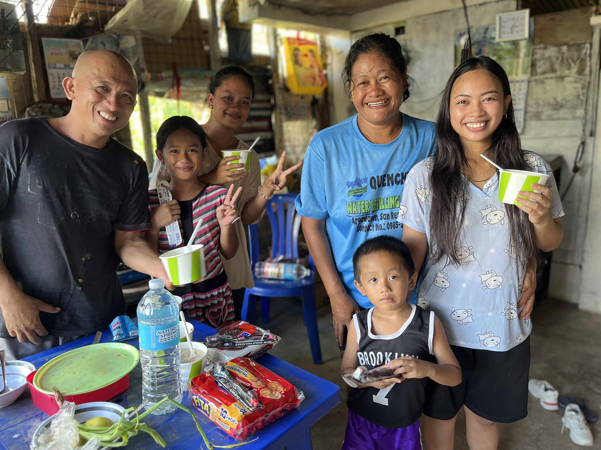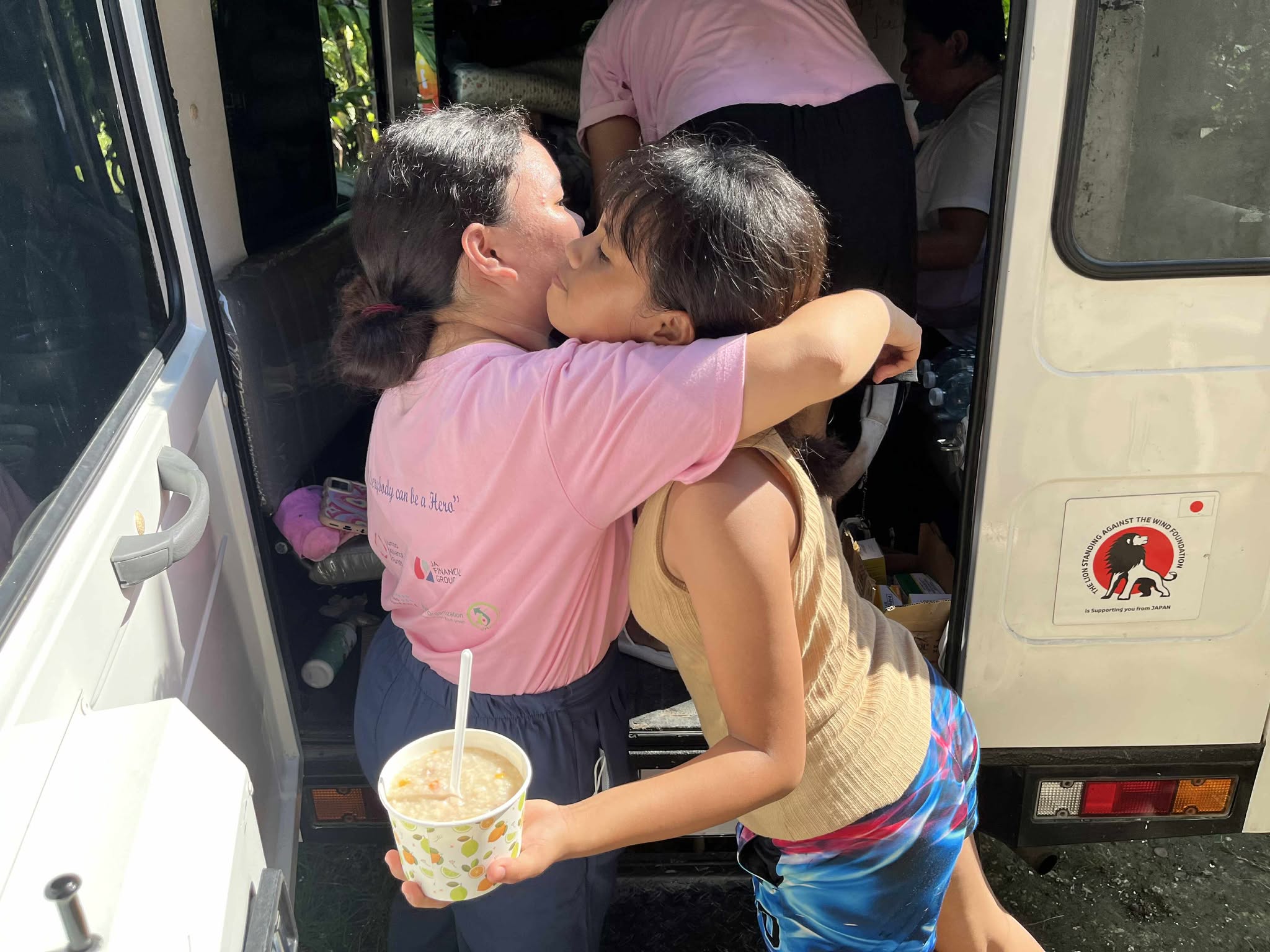 夜中の3時に出発し、道路の損壊や支援車両による大渋滞の中、12時間かけて被災地に到着しました。奨学生たちはセブ市内で手作りした栄養たっぷりのお粥を運び、一人ひとりに声をかけながら配布。「インスタント以外のごはんが食べられてうれしい」と、被災者から涙ながらの感謝の声が寄せられました。