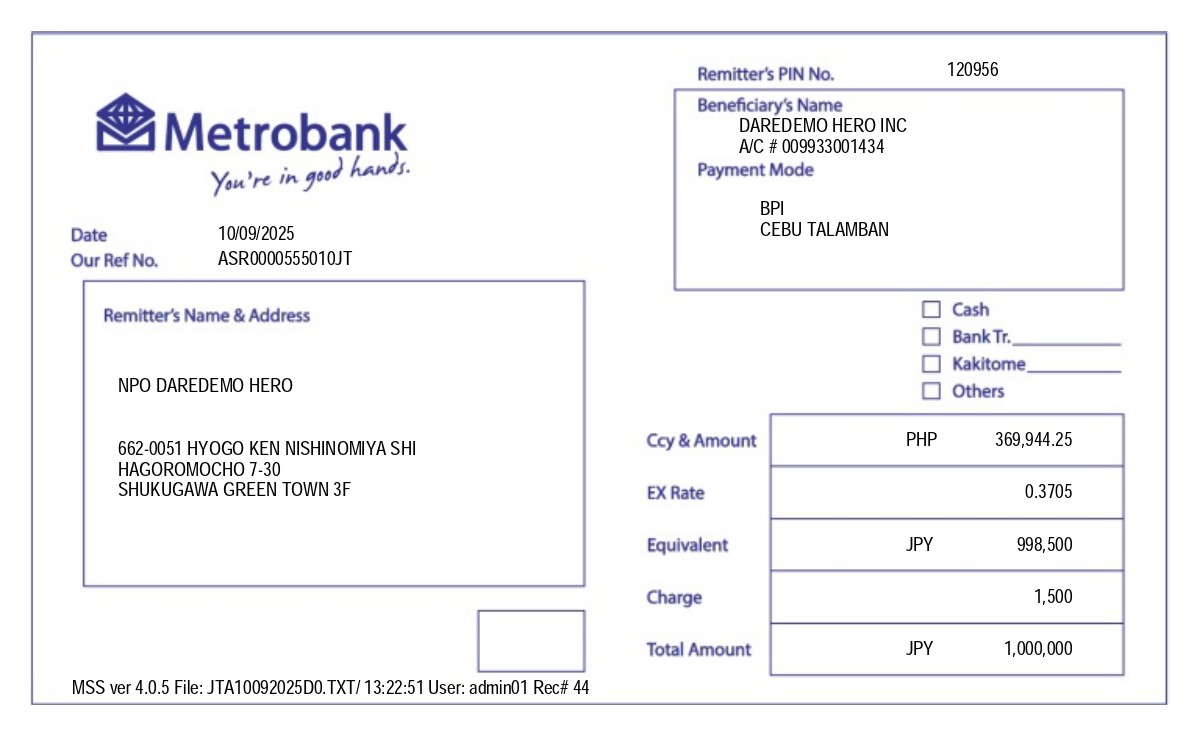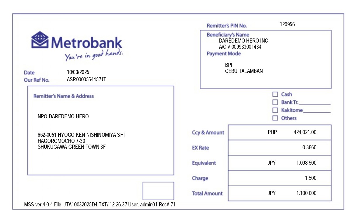現在、2回に分けて2,100,000円を、現地NGOに活動資金として送金しています。