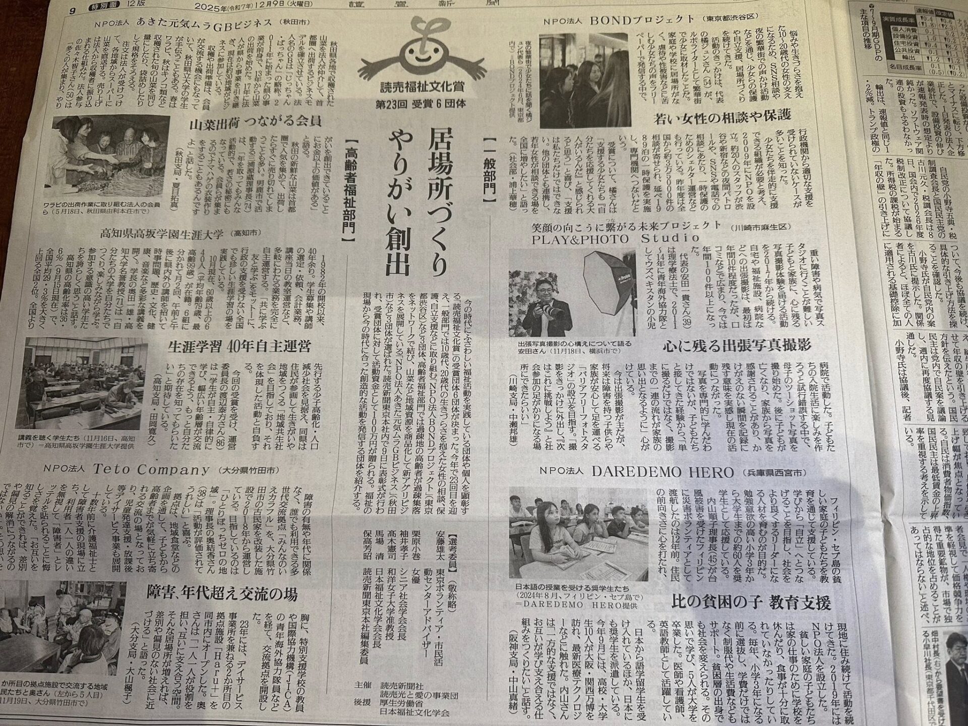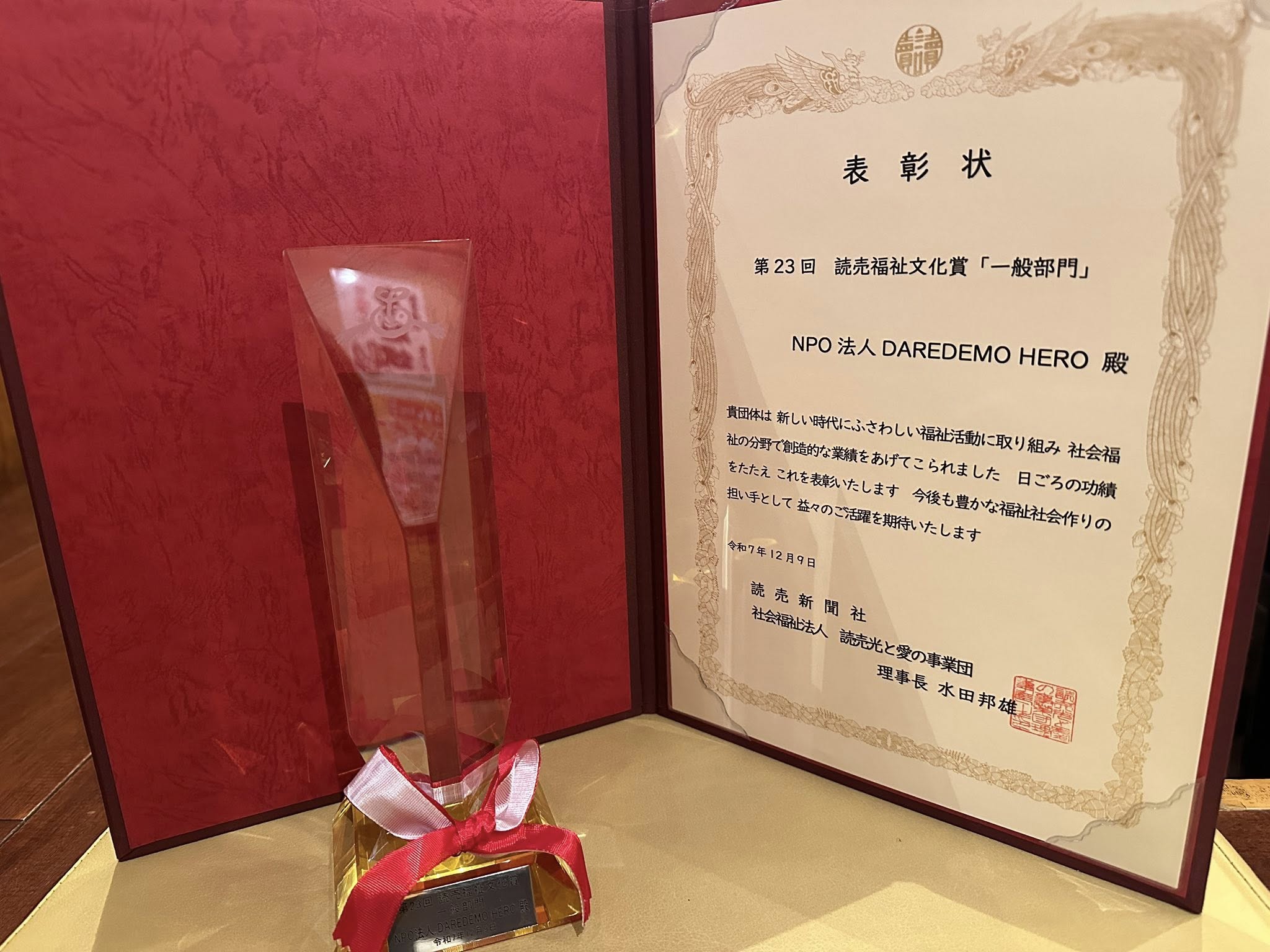 このたび、NPO法人DAREDEMO HEROは「第23回 読売福祉文化賞 一般部門」を受賞いたしました。